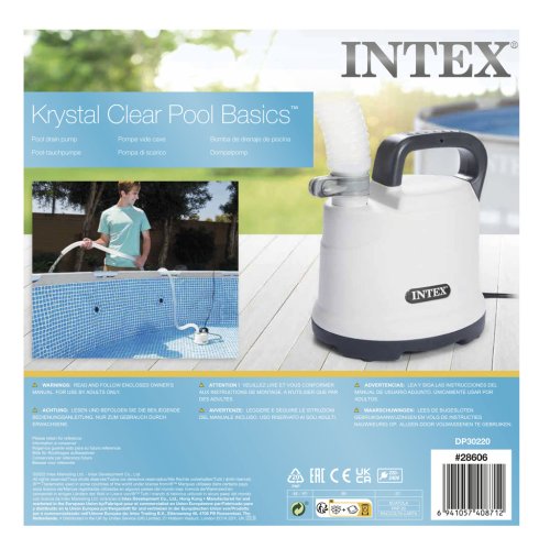 Vyprázdněte váš bazén pomocí vypouštěcího čerpadla Intex. Motor má kapacitu 3595L/ h. Je vhodné pro bazény s maximální hloubkou 122cm (i pro bazény o výšce 132cm, hladina však nesmí být vyšší jak 122cm). Balení obsahuje napájecí kabel o délce 10m a výpustní hadici o O 32mm a délce 5m. Napětí: 220-240V. Rozměry 18 x 20 x 15 cm. Rozměry balení 28 x 28 x 28.