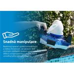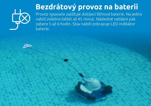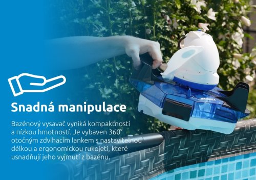 Vysavač je vybavený automatickým senzorem vody, který sepne motor pouze po ponoření do vody. Tím zajišťuje úsporu energií a zároveň prodlužuje životnost spotřebiče. Díky kompaktním rozměrům je manipulace s vysavačem opravdu pohodlná. Z bazénu ho vyndáte pomocí ergonomické rukojeti a o 360° otočného zdvihacího lanka s nastavitelnou délkou.