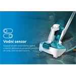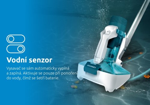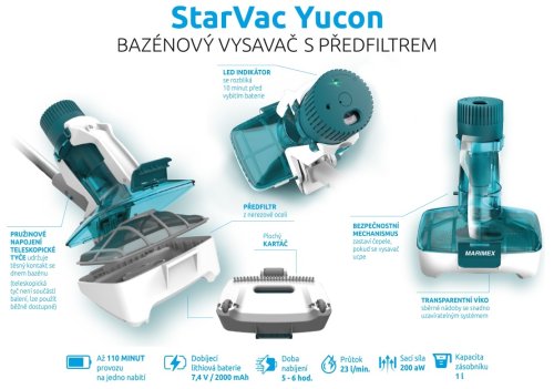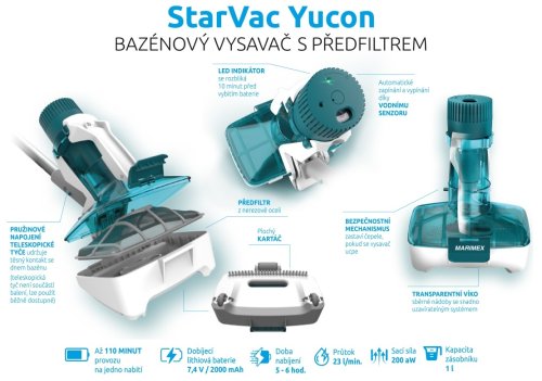 Bezdrátový bazénový vysavač Marimex StarVac Yucon je určený pro nadzemní i zapuštěné bazény s průměrem do 4,57 m. Je vybavený plochým kartáčem a předfiltrem z nerezové oceli, který spolehlivě zachytí hrubé nečistoty. Nádoba na sběr nečistot s objemem 1 l má průhledné víko, takže máte neustále přehled o jejím naplnění a nemusíte ji ani otevírat. Maximálně bezpečný provoz zajistí bezpečnostní mechanismus, který v případě ucpání přístroje zastaví čepele.