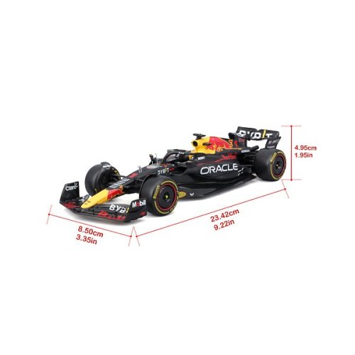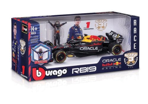 Bburago modely závodních vozů Formule 1 v měřítku 1:24 z kolekce RACE jsou sbírkou krásného designu s vysokým důrazem na přesnost detailů. Součástí modelů je plastová figurka jezdce F1 v mistrovské póze. Modely F1 ze stáje Oracle Red Bull Racing RB19 (2023) jsou vyrobeny z litého kovu s plastovými detaily. Každý z modelů je v klasickém závodním designu a se závodním číslem. Baleno v krabičce. Nevhodné pro děti do 3 let. Rozměry balení: 12,7 x 28 x 12,7 cm. Věk: 14+