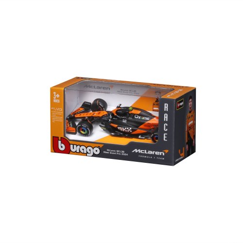 Bburago modely závodních vozů Formule 1 v měřítku 1:43 z kolekce RACE jsou sbírkou krásného designu s vysokým důrazem na přesnost detailů. Modely F1 ze stáje McLaren MCL38 (2024) jsou vyrobeny z litého kovu s plastovými detaily. Každý z modelů je v klasickém závodním designu a se závodním číslem. Baleno v krabičce. Nevhodné pro děti do 3 let. Rozměry balení: 6,7 x 14,7 x 7,5 cm. Věk: 3+