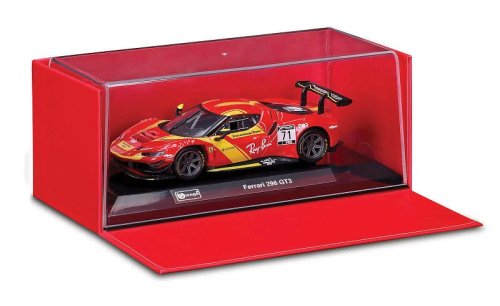 Modely závodních automobilů Ferrari v měřítku 1:43 z kolekce RACING jsou sbírkou krásného designu s vysokým důrazem na přesnost detailů. Modely jsou vyrobeny z litého kovu s plastovými detaily. Každý z modelů je v závodním designu a se závodním číslem. Model je namontován na výstavním stojánku a umístěn v dekorativním akrylovém boxu. Díky dekorativnímu boxu je tento model skvělým sběratelským kouskem a dárkem pro každou příležitost. Nevhodné pro děti do 3 let. Rozměry balení: 6,7 x 16 x 8,7 cm. Věk: 14+