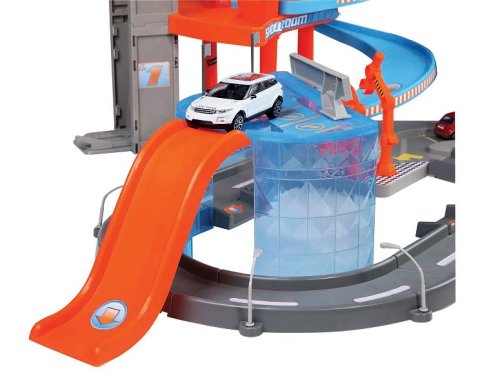 Bburago Street Fire – Mega Dealer Showroom. Zažij svět plný akce s velkou parkovací herní sadou z kolekce Street Fire. Čtyřpatrová garáž se showroomem, výtahem, rampou, nebo myčkou přináší dětem nekonečné hodiny zábavy. Součástí sady jsou dvě kovová autíčka Street Fire v měřítku 1:43, takže si malí řidiči mohou okamžitě začít hrát. Díky výtahu se auta snadno dostanou až na vrchol garáže, pak můžete zaparkovat v jakémkoliv patře nebo sjet až dolů po točité rampě a zamířit do showroomu nebo myčky. Sada je vyrobena z odolného plastu. Baleno v krabičce. Nevhodné pro děti do 3 let. Rozměry složené garáže: 90 x 70 x 63 cm. Rozměry balení: 35,8 x 55,8 x 11,1 cm. Věk: 3+