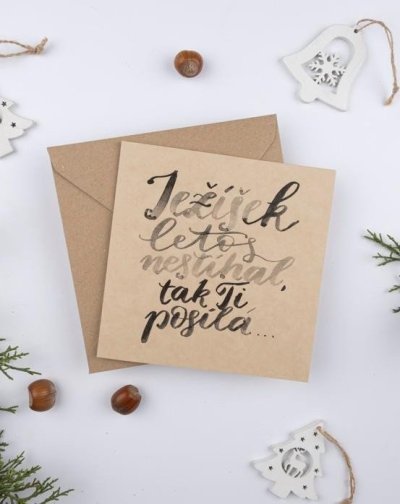 Be Nice EKO vánoční přání z recyklovaného papíru. Někdy se to stane každému z nás... Dárky se nestíhají, tak přijdou na řadu peníze či jiné méně hmotné dárky. Věnujte je vtipným přáním, které obdarovaného jistě potěší a dárku dodá šmrnc. Přání krasopisně nadepsala česká výtvarnice Bára z Nikolajky. Uvnitř přání bez textu. Rozměr: 15,5 x 15,5 cm