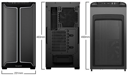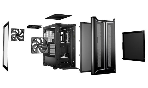 Skříň s perforovaným předním panelem a celoskleněným bočním panelem nabízí perfektní náhled na komponenty uvnitř a mimořádný průtok vzduchu. K dispozici jsou dvě 3,5" pozice pro pevné disky a pět 2,5" pozic pro SSD disky. Na horním panelu naleznete dva porty USB 3.0, jeden port USB-C a kombinovaný port sluchátek a mikrofonu. Osazena je třemi ventilátory Pure Wings 3 PWM o velikosti 140 mm. Důmyslné řešení umožňuje pohodlné umístění až 360 mm dlouhého výměníku vodního chlazení na přední straně. Ve skříni je dostatek prostoru pro chladič CPU do výšky až 178 mm a grafickou kartu o délce až 368 mm. Předností je také možnost otočit PCIe sloty o 90° pro svislou montáž širokých grafických karet. Skříň je dodávána bez zdroje. Potěší přítomnost odnímatelných prachových filtrů a elegantní ARGB osvětlení uvnitř i vně skříně.