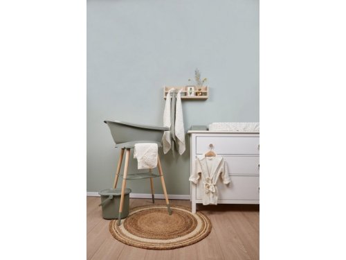 Velmi stabilní vanový stojan Sense má nohy vyrobeny z lakovaného bukového dřeva s certifikací FSC. To dodává stojanu teplý moderní vzhled. Je vybaven praktickými pomůckami; vpředu je připevněn držák na ručníky. Prostorná plastová polička poskytuje dostatek místa například na šampon, žínku, vodní hračky nebo koupací gel. To znamená, že máte po ruce všechny potřebné věci, abyste si s dítětem mohli koupání užít. Inovativní systém upevnění zajišťuje, že vanu lze snadno připevnit ke stojanu a rovněž snadno sejmout. Po kliknutí můžete své miminko nerušeně a bezpečně koupat.