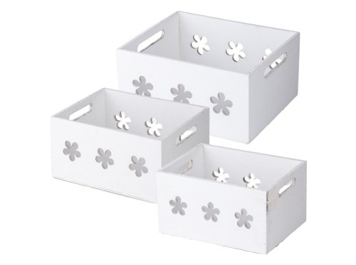 Tato sada tří dřevěných bedýnek s bílým nátěrem a jemným motivem kytiček je ideální pro dekorace i praktické uskladnění. Různé velikosti (300 × 250 × 150 mm, 250 × 200 × 130 mm a 200 × 150 × 110 mm) umožňují variabilní aranžmá a snadné skládání. Bedýnky lze využít jako květináče, organizéry či dekorativní úložné boxy. Přírodní materiál a jemný design dodávají domácnosti útulnou atmosféru a stylový vzhled.