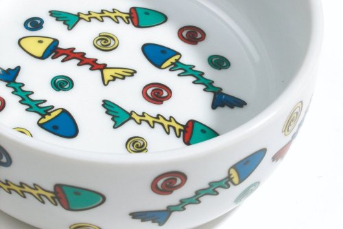 Roztomilá Beeztees ručně malovaná porcelánová miska pro kočky je vhodná na jídlo i vodu. Miska je stabilní, díky čemuž ji Vaše kočička nepřevrhne. Jakmile kočka jídlo z misky dojí, objeví se obrázek roztomilých rybích koster, což je pokyn pro další porci. Stejné obrázky jsou namalovány na vnější části misky. Průměr: 11 cm – 325 ml