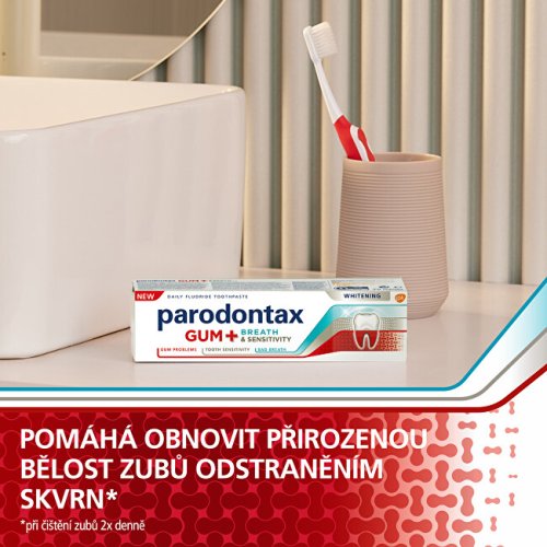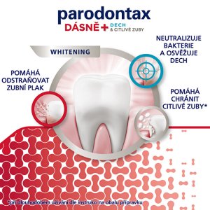 Parodontax zubní pasta na dásně, dech a citlivé zuby. Velmi efektivní zubní pasta, která pomůže s dodržením pravidelné zubní hygieny. Její používání je ideální prevence proti vzniku paradentózy. Péče o chrup bude díky používání této zubní pasty jednodušší a výsledky uvidíte nejen vy.
