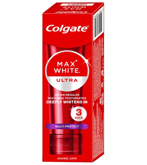 Vyzkoušejte bělení nové generace, které vám zajistí bělejší zuby za pouhé 3 dny při čištění zubů s bělící zubní pastou Colgate Max White Ultra Multiprotect. Tato multibenefitní bělicí zubní pasta je bezpečná pro zubní sklovinu při každodenním použití a poskytuje neabrazivní bělení výrazných skvrn. Na rozdíl od jiných bělicích zubních past, které odstraňují pouze povrchové skvrny, revoluční hloubková kyslíková reakce funguje jinak. Od prvního čištění zubů uvolňuje miliony molekul aktivního kyslíku, které bezpečně pronikají pod povrch skloviny a odstraňují tak výrazné skvrny způsobené jídlem a nápoji. Bělicí zubní pasta odstraňuje i povrchové skvrny, zabraňuje jejich dalšímu vzniku a chrání zubní sklovinu a citlivé zuby. Dopřejte si s touto klinicky ověřenou bělící zubní pastou stejně zářivý úsměv, jako jste vy.