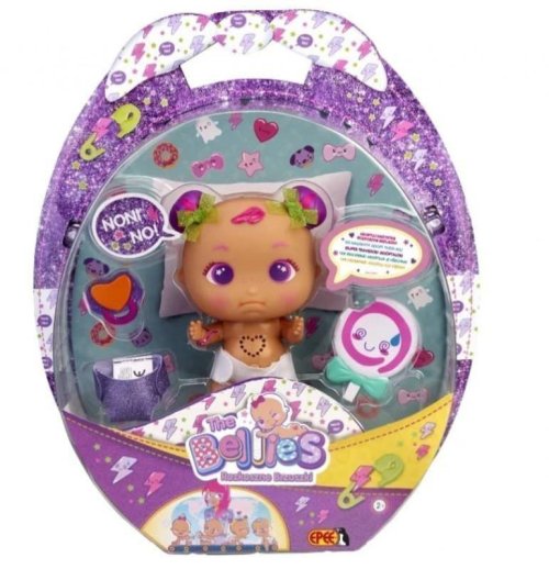 Roztomilá miminka Bellies hledají nový domov. Interaktivní miminka žvatlají a bije jim srdíčko. Každé má unikátní mateřské znaménko. Miminka Noni-No a Kuku-Cute mají unikátní třpytivé plínky a originální doplňky. Obsah balení: panenka, dudlík, bílá plenka, třpytivá plenka, láhev nebo lízátko, adopční listina.Mix 2 motivů bez možnosti výběru: Noni-No a Kuki-Cute. Pro děti od 2let.