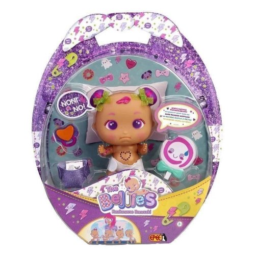 Roztomilá miminka Bellies hledají nový domov. Interaktivní miminka žvatlají a bije jim srdíčko. Každé má unikátní mateřské znaménko. Miminka Noni-No a Kuku-Cute mají unikátní třpytivé plínky a originální doplňky. Obsah balení: panenka, dudlík, bílá plenka, třpytivá plenka, láhev nebo lízátko, adopční listina.Mix 2 motivů bez možnosti výběru: Noni-No a Kuki-Cute. Pro děti od 2let.