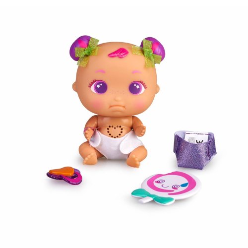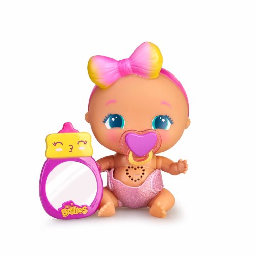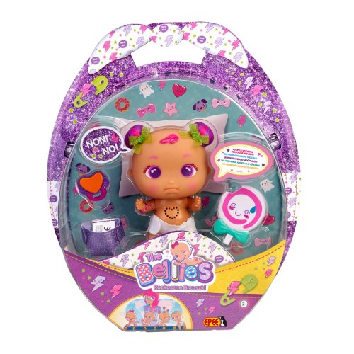 Roztomilá miminka Bellies hledají nový domov. Interaktivní miminka žvatlají a bije jim srdíčko. Každé má unikátní mateřské znaménko. Miminka Noni-No a Kuku-Cute mají unikátní třpytivé plínky a originální doplňky. Obsah balení: panenka, dudlík, bílá plenka, třpytivá plenka, láhev nebo lízátko, adopční listina. Assort 2: Noni-No a Kuki-Cute. Pro děti od 2let.