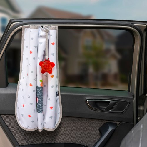 Speciální hvězda s oslnivým efektem pro extra zábavu a rozptýlení. Můžete ji posouvat, aby se otevřela, můžete stáhnout okno auta, aniž byste museli sluneční clonu sejmout, nebo ji můžete zavázat a zajistit pomocí všitých popruhů, aby vaše dítě vidělo ven. Nezbytná výbava pro pohodovou a zábavnou jízdu.