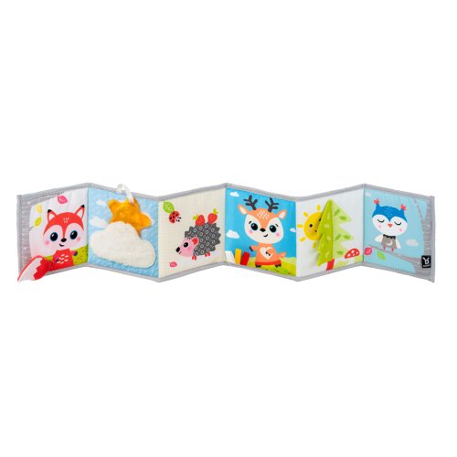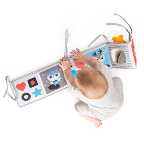 Barevná knížka, která stimuluje zrak a podporuje čas strávený na bříšku, lze používat v kočárku, postýlce nebo jako hračka na podlahu od narození. Stojí samostatně, leží naplocho nebo je svázána. Barevná strana je plná vzrušujících barev a hmatových aktivit na podporu rozvojových dovedností. Snadno se skládá a přenáší kdekoli na cestách.