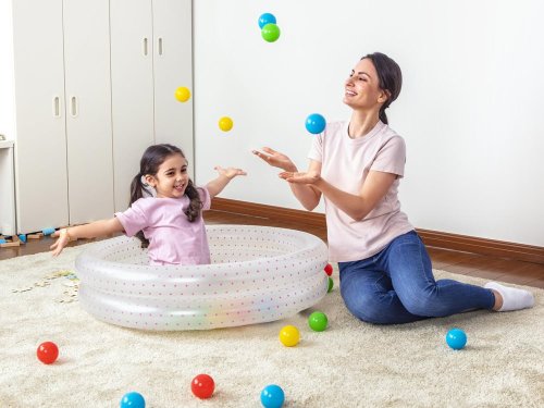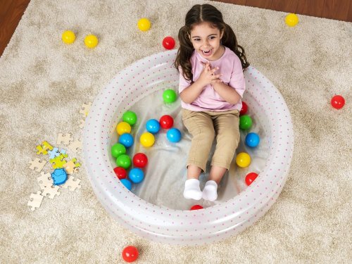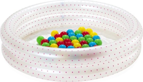 Nafukovací dětský bazén s motivem ve tvaru kruhu ve kterém jsou hrací míčky je ideálním řešením pro pohodlné a bezpečné koupání. Obvod tvoří dvě nafukovací komory. Bazén má bezpečnostní ventily a je vyroben z předem testovaného vinylu.