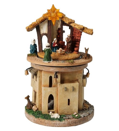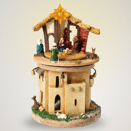 Interaktivní betlém z polyresinu přináší kouzelnou atmosféru Vánoc díky LED osvětlení, hudbě a otočné kulisové scéně. Ideální jako dekorace na stůl nebo poličku, přináší radost dětem i dospělým.