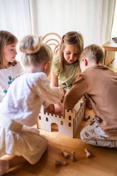 Pro každého rytíře či princeznu je tady panáčkovo království, které si děti mohou dotvořit podle své fantazie a vytvořit svůj jedinečný svět. Ať už použijí pastelky, fixy, vodovky či samolepky, výsledkem bude vždy originální umělecké dílo, na které mohou být náležitě pyšné. Možnosti jsou neomezené! Tento dřevěný hrad je ideálním prostředkem pro rozvoj fantazie a uměleckých dovedností. Každý dílek splňuje přísné bezpečnostní normy a má certifikaci CE, což zaručuje bezpečnost a vhodnost pro použití dětmi od tří let. Součástí hradu jsou také 4 figurky dřevěného lesního panáčka. Hlavní vlastnosti: vyrobeno z březového dřevarozvíjí kreativitu a umělecké dovednostisplňuje přísné bezpečnostní normycertifikace CE