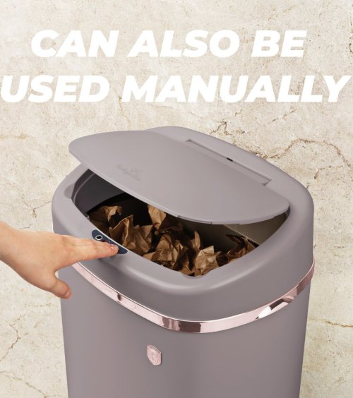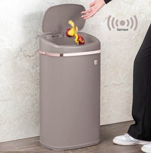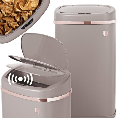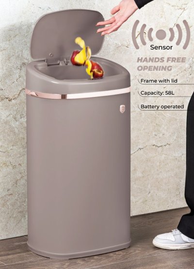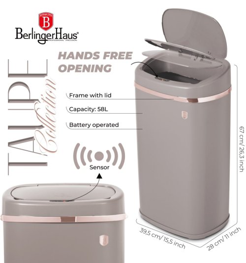 odpadkový koš vhodný do kuchyně i koupelny nebo wc - tichý senzorový systém víka - 4 ks AA baterie nejsou součástí balení - tělo i víko vyrobeno z nerezové oceli - rozměry 67x39,5x28 cm - objem: 58 litrů - kolekce Taupe Collection - značka BerlingerHaus