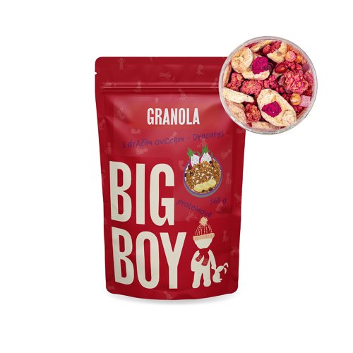 Rozšiřujeme dračí rodinku o proteinovou granolu s dračím ovocem. Na této granole si pochutnáš, obsahuje totiž velké kousky ovoce, celé kousky oříšků a křupavou granolu obohacenou o protein. Být eko je teď trendy, navíc ušetříš nějaké ty korunky. Big Boy ti nyní dává možnost si vybrat, zda chceš klasické naše balení se vší parádou, či naše eko/ekonomické balení. Na chuti a ani vzhledu eko balení nemá vliv. Navíc to může vyřešit tvůj problém, co dělat s větším množstvím obalového materiálu. EKO sáček snadno přesypeš do dózy, kterou jsi zakoupil/a při koupi standardního balení za plnou cenu. Náš tip: zalij si dračí granolu mlékem a promíchej, můžeš se těšit na krásné růžové zbarvení mléka. Tabulka nutričních hodnot: