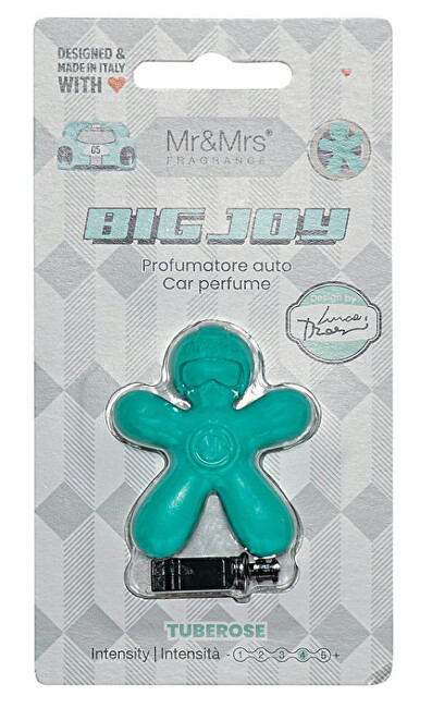 Květinová vůně do auta Big Joy Tuberose Green provoní váš vůz až po dobu 2 měsíců. Bojuje s nepříjemnými pachy, jako je například kouř z cigaret, a příjemně osvěží vzduch. Panáčka stačí připevnit na ventilátor klimatizace díky úchytu, který je součástí balení.