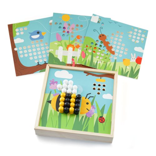 Rozehrajte obrázky s motivy zahrádky pomocí různobarevných kolíčků. Umisťujte je v souladu s okolními barvami, nebo dle vlastní fantazie. Nechejte děti hrou rozpoznávat barvy, rozvíjet poznávací dovednosti, soustředění i zručnost. Obrázky se umisťují na víko kompaktní krabičky, do které můžete všechny součásti prakticky uložit. Mozaika tak může být vždy uklizená i připravená na cesty. Všechny součásti jsou vyrobeny z kvalitního a odpovědně získaného dřeva, které je příjemné na dotek, a pomáhá tak přirozeně stimulovat hmat. Hlavní vlastnosti:4 obrázky a 96 kolíčků (8 různých barev)praktické baleníatraktivní dřevěné zpracování
