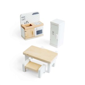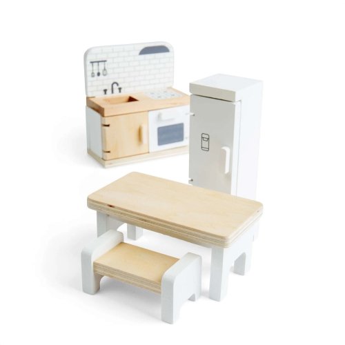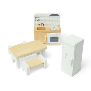 Proměňte domeček pro panenky v útulný domov plný vůní a společných chvil s touto stylovou kuchyňskou sadou. Děti mohou připravovat imaginární jídla, servírovat svačiny a usazovat panenky ke společnému stolu – fantazii se meze nekladou. Moderní kuchyňská sada nabízí realistické prvky, které podporují hraní rolí i vyprávění vlastních příběhů z každodenního života. Při manipulaci s jednotlivými dílky si děti přirozeně rozvíjejí jemnou motoriku, koordinaci rukou a očí i sociální dovednosti. Nábytek je vyroben z kvalitního, odpovědně získaného dřeva s certifikací FSC®, takže je bezpečný, odolný a šetrný k životnímu prostředí. Sadu lze kombinovat s dalšími doplňky do domečku pro panenky a vytvořit tak kompletně vybavený domov. Hlavní vlastnosti: kuchyňská sada do domečku pro panenkyobsahuje 5 kusů nábytku: lednici, troubu se sporákem a dřezem, jídelní stůl a 2x lavici k sezenípodporuje kreativitu, hraní rolí a vyprávění představivostirozvíjí jemnou motoriku a koordinacivyrobeno ze dřeva s certifikací FSC®odolné provedení vhodné pro každodenní hranívhodné pro děti od 3 let Značka a certifikát FSC® (Forest Stewardship Council) zaručuje, že dřevo, ze kterého byl produkt vyroben, nebylo vytěženo nelegálně a pochází z lesů obhospodařovaných šetrným či přírodě blízkým způsobem, ve kterém jsou dodržovány přísné environmentální a sociální požadavky. Značka FSC® na výrobku znamená, že svým nákupem pomáháte chránit lesy a podporujete šetrné, odpovědné či přírodě blízké hospodaření, díky kterému jsou naše lesy stabilnější, zdravější, mají přirozenou druhovou skladbu a lépe odolávají negativním následkům klimatických změn.