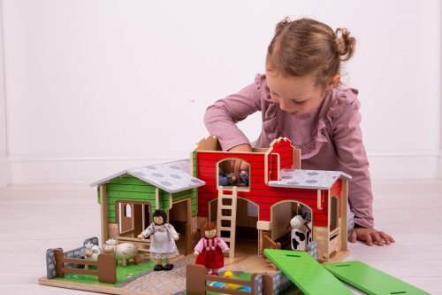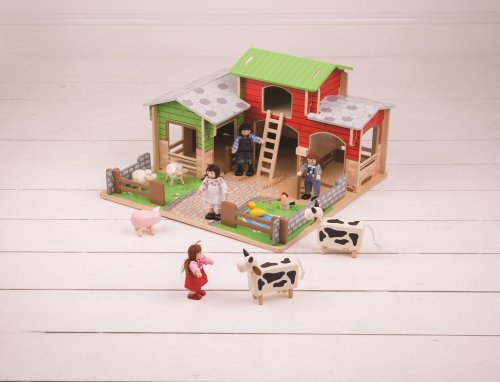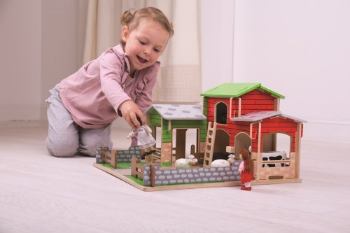 Jste připraveni na rušný den na farmě? Dřevěná farma Cobblestone s otevíracími vraty, stájí, seníkem, kachním rybníkem a také garáži pro traktory. Farmáři se mohou dostat k seníku, když použijí pohyblivý žebřík. Zabezpečí zvířátka v jejich ohradách s pohyblivými vraty. Odnímatelná střecha dětem dovoluje dostat se jednoduše do stodoly a nabízí tak plnohodnotné využití farmy. Idealní velikost farmy pro děti. Jednoduše složte dřevěné dílky do sebe a zábava na farmě může začít! Je to skvělý způsob jak rozvíjet vypravěčské dovednosti, koordinaci, zručnost a jemnou motoriku u dětí. Lze dokoupit další doplňky dle vlastní fantazie. Vyrobeno z kvalitních materiálů z odpovědných zdrojů. Hlavní vlastnosti: pohyblivá vrata, ohrádky farmyodnímatelná střechalze dovybavit dle vlastní fantazierozvíjí komunikační dovednosti, motoriku a koordinaci
