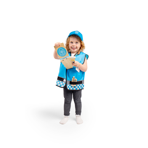 Malí hrdinové mohou přijít na pomoc v tomto dětském kostýmu policisty. Ať už jde o chytání zločinců, nebo pomáhání lidem, možnosti předstírané hry jsou nekonečné. Vestu lze prát v pračce, bavlněnou nastavitelnou čepici ručně. Testováno podle nejnovějších předpisů EN71 a REACH. Hlavní vlastnosti: příslušenství: dřevěná vysílačka, identifikační odznak, peněženka na doklady, svítilna a poutavesta se suchými zipynastavitelná čepice (48 až 57 cm)vhodné pro děti od 3 do 5 letnápadité a detailní zpracování