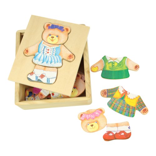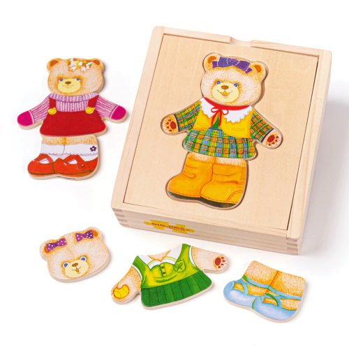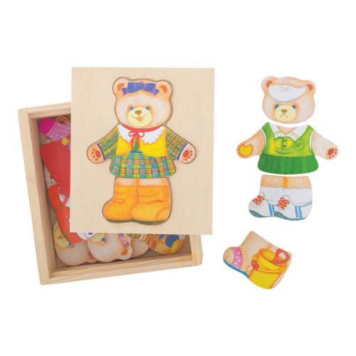 Dřevěné oblékací puzzle obsahuje celou řadu pestrobarevných dřevěných dílků, včetně oblečení a obličejů medvědice s různými výrazy. Jednotlivé díly se skládají na destičku, která zároveň slouží jako víko krabičky. Praktická krabička k uložení všech dílků puzzle. Rozvíjí schopnosti třídění a posiluje každodenní slovní zásobu. Pomáhá rozvíjet zručnost a koordinaci. Vyrobeno z vysoce kvalitních a zodpovědně zpracovaných materiálů. Vyhovuje současným evropským bezpečnostním normám. Hlavní vlastnosti: obsahuje 18 dílků puzzlepraktická krabička k uložení všech dílků puzzlerozvíjí slovní zásobu a motoriku dětí