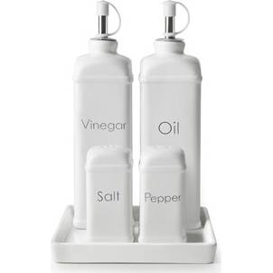 Bílá keramická menážka na olej a ocet. Sada zahrnuje také pepřenku a slánku a keramický podtácek.