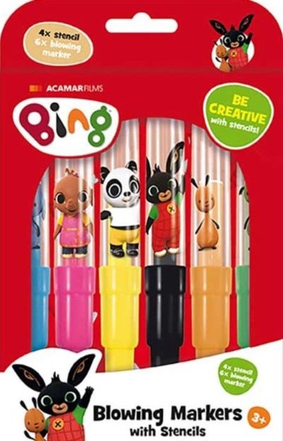 Balení obsahuje 6 barevných foukacích fixů s potiskem a 4 barevné papírové šablonky v oblíbených motivech.