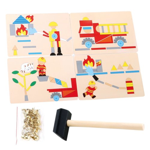 Oblíbená hra s kladívkem skvěle podporuje tvořivost a představivost dětí. Z rozmanitých různobarevných dílků lze vytvořit mnoho motivů a s pomocí hřebíčků a kladívka je připevnit do korkové podložky a opětovně rozebrat. Rozvíjí jemnou motoriku, trpělivost i koordinaci očí a rukou dítěte. Hlavní vlastnosti:podložka, kladívko, 78 dřevěných a 8 papírových dílků, 80 hřebíčků
