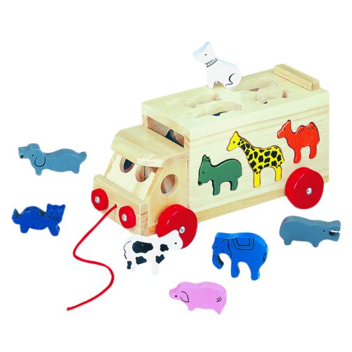 Náklaďák plný pestrobarevných figurek exotických i domácích zvířátek může dítě doprovázet na jeho cestách, díky praktické šňůře slouží také jako tahací hračka. Rozvíjejte jemnou motoriku, vkládejte a rozpoznávejte tvary, barvy a druhy zvířat. Učte dítě opatrně chodit, aby zvířátka nevysypalo. Hračka je robustní, vyrobena z masivního dřeva. Hlavní vlastnosti:náklaďák a 10 dílů ke vkládání2 v 1, vkládačka a tahací hračkarozvíjí motoriku, rozpoznávání barev a tvarůrobustní dřevěné provedení