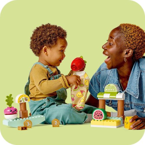 Tvořivá vzdělávací stavebnice pro nejmenší Hračky LEGO DUPLO dávají těm nejmenším možnost zažít neomezené tvoření, sebevyjádření a zábavné učení. Tato stavebnice inspiruje děti a dospělé k společnému interaktivnímu hraní, ve kterém se z jednoho stane stánkař s ovocem a zeleninou a z druhého zákazník. Stavebnice DUPLO umožní rodičům a malým dětem sdílet vzácné vývojové milníky, zatímco si spolu hrají a staví.