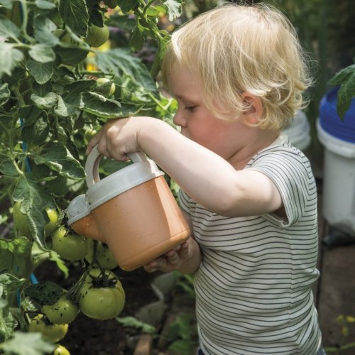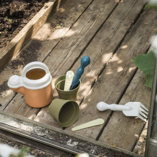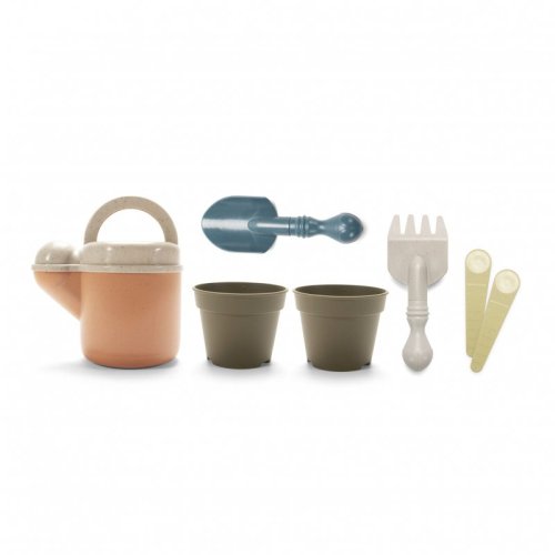 souprava se skládá ze 7 dílů - lopatka + hrabičky + konvička + 2 květináče + 2 sázecí kolíky