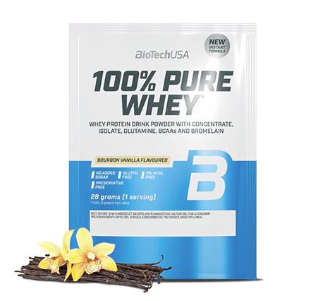100% Pure Whey je vysoce kvalitní proteinový prášek s vysokou biologickou hodnotou. Je kombinací syrovátkového koncentrátu, syrovátkového izolátu a přidaných aminokyselin (L-glutamin, L-arginin a BCAA). Díky nízkému obsahu sacharidů a tuků je vhodný i v dietní fázi. Neobsahuje lepek, palmový olej, ani přidaný cukr. K dostání je v pestré škále příchutí. Přednosti: