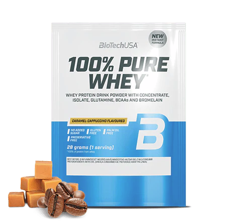 100% Pure Whey je vysoce kvalitní proteinový prášek s vysokou biologickou hodnotou. Je kombinací syrovátkového koncentrátu, syrovátkového izolátu a přidaných aminokyselin (L-glutamin, L-arginin a BCAA). Díky nízkému obsahu sacharidů a tuků je vhodný i v dietní fázi. Neobsahuje lepek, palmový olej, ani přidaný cukr. K dostání je v pestré škále příchutí. Přednosti: