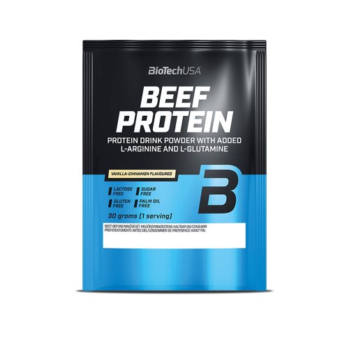 Beef Protein od BioTechu je hovězí protein bez cukru, laktózy a lepku. Základ proteinu tvoří hydrolyzovaná peptidová forma hovězích bílkovin, která je obohacena o L-glutamin a L-arginin. Hovězí protein je zdrojem kvalitních bílkovin, které jsou snadněji stravitelné, než nízkotučné hovězí maso (např. steak), má skvělou vstřebatelnost a jako všechny živočišné bílkoviny i vynikající biologickou hodnotu. Beef Protein je bez přidaného kreatinu a přestože má nízký obsah tuku, obsahuje kokosový tuk, který je vynikajícím zdrojem MCT (triglyceridy se středním řetězcem).