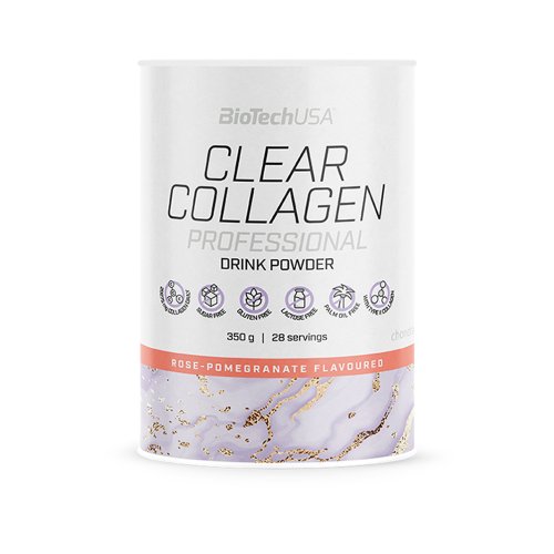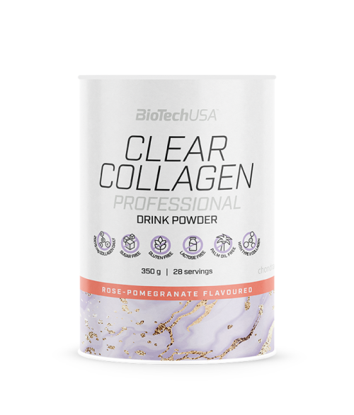 Osvěžující ochucený nápoj v prášku obsahující hydrolyzovaný kolagen, kyselinu hyaluronovou, aminokyseliny, vitamíny, minerály, cukr a sladidlo. vysoce rozpustný a chutný více než 20 g kolagenu na denní dávku (2 x 12,5 g produktu) 105 mg kyseliny hyaluronové ChondrActiv® hydrolyzovaný prášek pro podporu tvorby chrupavek obohacený o kolagen typu II s vitamíny a minerály s aminokyselinami a antioxidanty3 bez cukru bez laktózy bez lepku bez tuku a bez palmového oleje Bez laktózy: méně než 0,1 g laktózy na 100 ml hotového výrobku připraveného k pití. Bez lepku: dle nařízení EU Bez cukru: méně než 0,5 g cukru na 100 ml hotového výrobku připraveného k pití. Bez tuku: méně než 0,5 g tuku na 100 ml hotového výrobku připraveného k pití. Podobně jako Clear Collagen obsahuje produkt Clear Collagen Professional hydrolyzovaný kolagen s přidaným vitamínem C, který přispívá k normální tvorbě kolagenu, k udržení normální pokožky, normální funkci krevních cév, chrupavek, zubů a dásní. Clear Collagen Professional také obsahuje ChondrActiv® hydrolyzovaný prášek pro podroru tvorby chrupavek. Výrobek je obohacen o vitamíny a minerály, které přispívají k udržení normálního stavu pokožky, vlasů, nehtů a chrupavek. Některé z přidaných stopových prvků (zinek, vitamín C, vitamín E, selen, měď a riboflavin) mají antioxidační vlastnosti, které přispívají k ochraně buněk před oxidačním stresem.