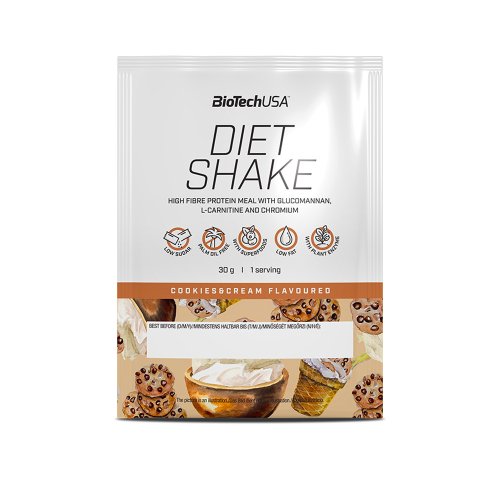 alespoň 15 g bílkovin na porci (v závislosti na chuti) Bohatý na vlákninu Se 6 druhy zdrojů vlákniny Obsah chrómu pomáhá optimalizovat hladinu cukru v krvi* Nízký obsah tuku Se superfoods S enzymem bromelain Bez palmového oleje KONTROLA JE VE VAŠICH RUKOU Nezáleží na tom, zda je vaším cílem zhubnout, objem nebo celková změna životního stylu, základem všeho je dobře naplánovaná a vyvážená strava. Ale to neznamená, že se musíte vzdát lahodných chutí a být na sebe příliš tvrdí. S pestrým jídelníčkem může být každá dieta plná dobrot! Převezměte zpět kontrolu, naplánujte si přesně svůj jídelníček a utište své chutě! POTŘEBUJEME JÍST, ALE KDY? Už jsme mnohokrát slyšeli a četli, že základem zdravého stravovacího návyku je jíst 4–5krát denně. Ale v rušný všední den často nemáme čas na snídani nebo oběd. Nepravidelné stravovací návyky znesnadňují dosažení našich cílů v oblasti tvarování těla, takže se vyplatí věnovat trochu energie plánování našich jídel! A některé doplňky stravy mohou také usnadnit zlepšení našich stravovacích návyků! Diet Shake se perfektně hodí do nízkokalorické diety, protože s vodou obsahuje maximálně 110 kcal na porci (záleží na chuti). Díky tomu je to skvělá volba kdykoli během dne k doplnění jídla, pokud máte hlad a chcete rychlé a chutné řešení; nalijte do šejkru, přidejte 300 ml vody, dobře protřepejte a vypijte! VÍCE NEŽ PROTEIN Jednou z hlavních složek Diet Shake je koncentrát syrovátkové bílkoviny, který je hlavním zdrojem bílkovin produktu. Výrobek také obsahuje 6 různých zdrojů vlákniny, které mají důležité fyziologické účinky. Výrobek jsme obohatili o rozpustnou dietní vlákninu, jako je glukomannan, oves, psyllium, inulin, prášek z lněných semínek a citrusová vláknina. Glukomannan a psyllium se často používají k zahušťování, protože účinně absorbují vodu a bobtnají až na několikanásobek své vlastní hmotnosti. Dietní koktejl také obsahuje vápník a chrom. *Chrom přispívá k udržení normální hladiny cukru v krvi a hraje zásadní roli v normálním metabolismu makroživin (tuků, sacharidů, bílkovin). Výrobek jsme také obohatili o následující aktivní složky: L-karnitin a enzym bromelain. Přidané super potraviny také dělají produkt komplexnějším. Prášek z lněných semínek je skvělým zdrojem kyseliny alfa-linolenové, což je esenciální mastná kyselina (omega-3 rostlinného původu). Prášek z Acai berry je bohatý na flavonoidy a plody goji jsou bohaté na esenciální aminokyseliny a také obsahují vitamín C. Doporučené dávkování: