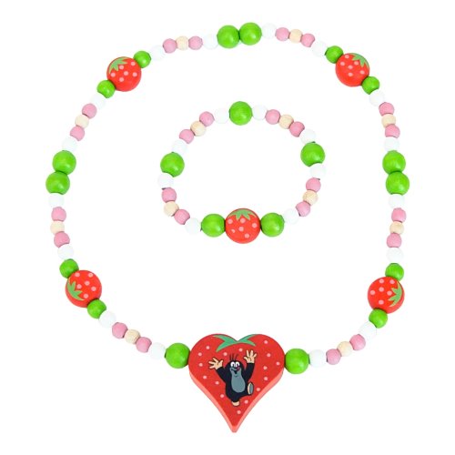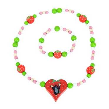 Dřevěná bižuterie s krtečkem a jahůdkami. Navlečeno na jemné gumičce. Nevhodné pro děti do 3 let. Obsahuje malé části. Výrobek je zdravotně nezávadný.