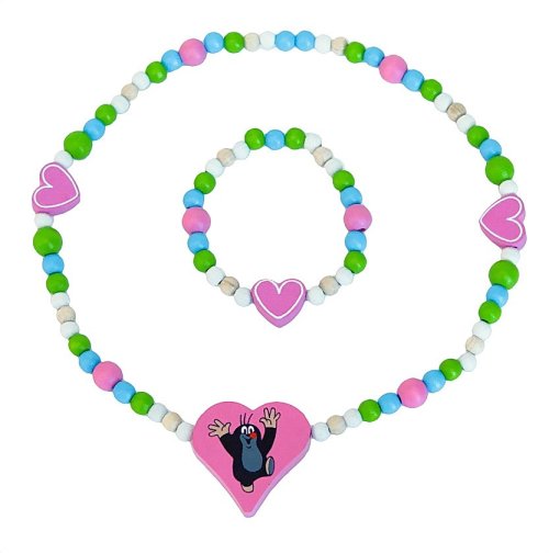 Dřevěná bižuterie se srdíčky a krtečkem. Navlečeno na jemné gumičce. Nevhodné pro děti do 3 let. Obsahuje malé části. Výrobek je zdravotně nezávadný.
