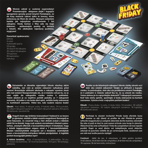 Zůčastněte se šíleného výprodeje! Ulovte všechny akční nabídky, než vám je ostatní zákazníci vyfouknou před nosem! Brouzdejte uličkami obchodu a nakupte vysněné zboží drív než ostatní! Nezapomínejte ale, že si můžete vzít jen to, co se vám vejde do nákupního vozíku cestou k pokladně. Vaším úkolem je, co nejdříve pořídit položky se 7 nákupních seznamů. Až jeden z vás tento úkol splní, sečtěte body zobrazené na kartičkách seznamů. Vítězí ten, kdo nasbírá nejvíce bodů. Rozměr krabice: 26 x 26 x 4 cm Vhodné od 10 let