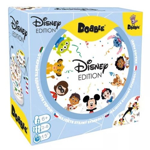Objevte symboly s vašimi oblíbenými postavičkami od Disneyho a Pixaru v této speciální edici klasické hry Dobble: hry na postřeh a rychlé reflexy, která je vhodná pro každého.