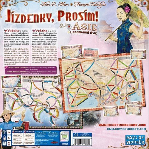 Rozšíření veleúspěšné cestovatelské hry Jízdenky, prosím! s dvěma různými mapami a klasickou i týmovou hrou. Vydejte se na neuvěřitelné týmové dobrodružství s mapou Asie, kde se společně ve dvojici postavíte soupeřům na 25 000 km dlouhé cestě z Kábulu do Pekingu, přes stepi Mongolska a poušť Gobi až ke Žluté řece! Mapa Asie je navržena speciálně pro týmovou hru se 4 nebo 6 hráči. Pokud ale dáváte přednost klidnějšímu potěšení z cestování po Hedvábné stezce či procházení shonem Indočíny, tak je pro Vás připravena mapa Legendární Asie, která je obrazem dalekých východních zemí na úsvitu 20. století. Jen si buďte jisti hrůzostrašnou jízdou horskými průsmyky Himaláje! Toto není samostatná hra! Ke hře je třeba základní hra Jízdenky, prosím! nebo Jízdenky, prosím! Evropa. Obsah balení: