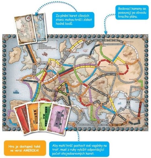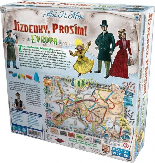 Ze strmých strání Edinburghu po sluncem zalité doky Cařihradu, přes prašné uličky Pamplony až po větrem zametanou stanici v Berlíně. Jízdenky, prosím! Evropa Vás vezme na nové vlakové dobrodružství skrze velká města Evropy konce 19. století. Odvážíte se riskovat cestu temnými tunely Švýcarska? Cestovat na palubě trajektu přes Černé moře? Nebo budete stavět nádraží v hlavních městech starých říší? Váš příští krok z Vás může učinit největšího vlakového magnáta Evropy! Jízdenky, prosím! Evropa je další hra ze série skvělých vlakových dobrodružství. Hráči sbírají barevné karty železničních vagónů a s jejich pomocí staví nádraží, projíždějí tunely, naloďují se na trajekty a spojují tratě napříč Evropou. Jízdenky, prosím! Evropa je hra, kterou se můžete naučit za 5 minut a užijete si ji jak v rodinném kruhu, tak se zkušenými hráči. Balení obsahuje vše, co potřebujete ke hře, aniž byste potřebovali originální hru Jízdenky, prosím! která získala titul Spiel des Jahres. Hra obsahuje: - herní plán s mapou Evropy - 15 barevných nádraží - 240 barevných vagónů - 110 karet vagónků - 46 karet cílových stanic - 5 dřevěných bodovacích žetonů - 1 pravidla