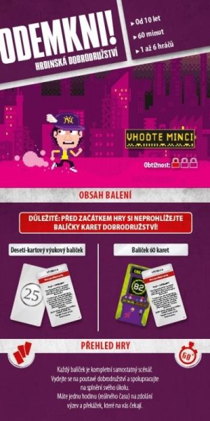 Kooperativní karetní hra inspirovaná únikovými místnostmi. Projděte všechny úrovně v tomto virtuálním dobrodružství. Unikněte, nebo Game Over! Prohledejte místnosti! Kombinujte objekty! Řešte rébusy! Únikové místnosti jsou místnosti, ze kterých se snažíte uniknout za méně než 60 minut. ODEMKNI! vám umožní tyto zkušenosti zažít doma u stolu. Obtížnost této hry je 1,3. Obsah balení: 60 karet 10 výukových karet 1 česká pravidla Desková hra Odemkni! vyžaduje stažení bezplatné aplikace. Jakmile ji stáhnete, v průběhu hry již není internetové připojení potřeba.