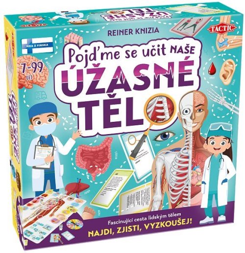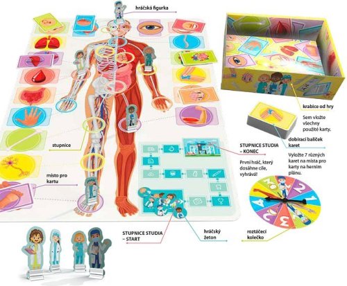 Připravte se na hru a prozkoumejte tělo od hlavy až k patě. Budete postupovat na stupnici studia a dozvíte se spoustu fascinujících faktů o tom, jak naše tělo funguje. První hráč, který dorazí do cíle, se stane doktorem Pohybujte svou figurkou po herním plánu, odpovídejte na zábavné otázky o lidském těle a o tom, jak funguje, a sami si vyzkoušejte různé pohyby. Úspěšné zvládnutí úkolů vás posune vpřed na cestě k tomu, abyste se stali doktorem, ale ostatní hráči se budou snažit být ještě rychlejší než vy. Ve hře jsou tři typy výzev: hledání, otázky a cvičení. Vyrazte na fascinující cestu lidským tělem! Balení obsahuje: 1 herní plán, 5 hráčských figurek, 5 hráčských žetonů, 150 karet, 1 roztáčecí šipka, 1 žeton lupy, a česká pravidla.