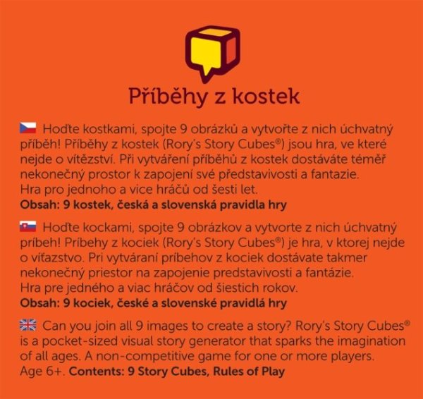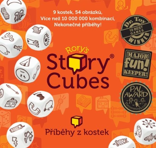 Jedinečná hra, která rozvíjí představivost a kreativitu dětí i dospělých pro jednoho a více hráčů od šesti let. 9 kostek, 54 obrázků, 10 miliónů kombinací, nekonečné pohádky... Hoďte kostkami, spojte 9 obrázků a vytvořte z nich úchvatný příběh! Příběhy z kostek (Rory´s Story Cubes) jsou hra, ve které nejde o vítězství. Při vytváření příběhů z kostek dostáváte téměř nekonečný prostor k zapojení své představivosti a fantazie. Princip hry: Hoďte kostkami a podívejte se na obrázky, které Vám padly. Začněte skládat příběh, ve kterém se vše, co je na kostkách, objeví. Příliš nepřemýšlejte, začněte některým z obrázků a příběh se začne rozvíjet sám. Buď jen tak vyprávějte nebo soutěžte o nejzajímavější příběh. Baleno v praktické a zároveň atraktivní krabičce z pevného kartonu, s magnetickým uzávěrem. Hra obsahuje: 9 kostek s obrázky, česká a slovenská pravidla
